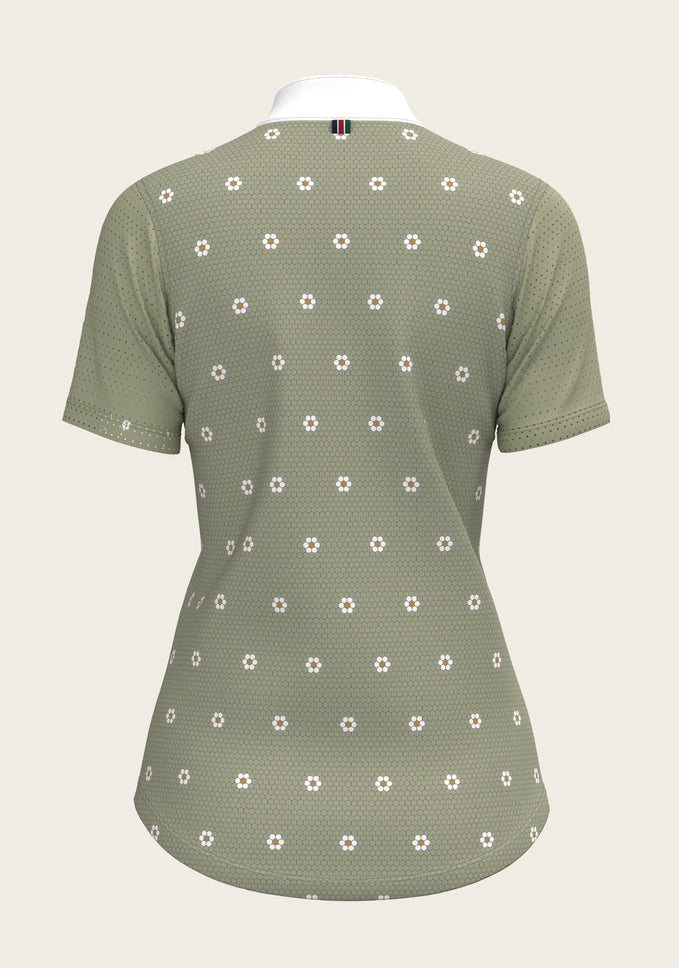 Featuring a flattering slim fit with delicate pleated detailing, this show shirt enhances both style and movement. The short sleeves provide added breathability, while the hidden zip closure ensures a seamless and polished look. The hand-illustrated Mosaic Daisies print in an elegant olive tone adds a unique and sophisticated touch to your competition wardrobe.