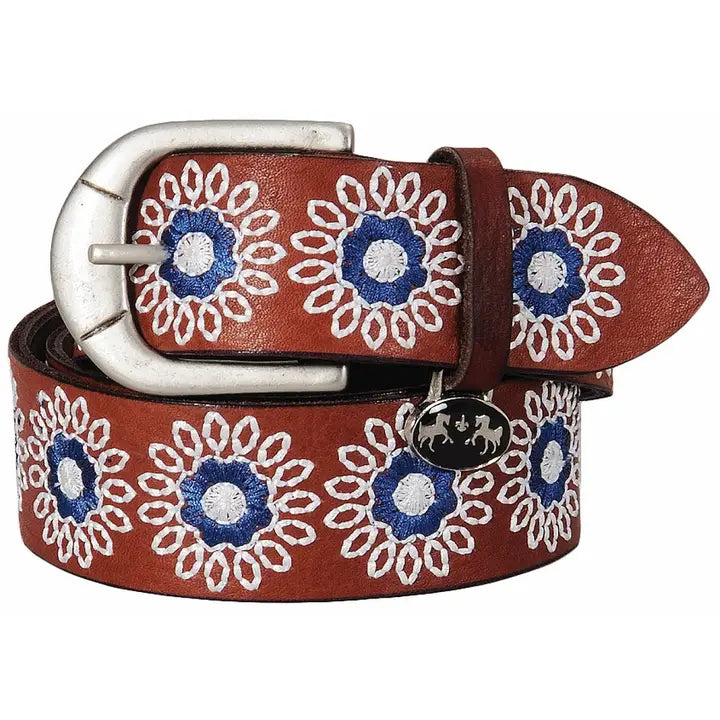 Our Equine Couture Sophia Leather Belt will add just a touch of bohemian style to your wardrobe. The cheerful blue and white floral pattern stands out against the rich Oakbark leather. The Sophia belt will complete any outfit, whether it be worn with breeches or jeans.