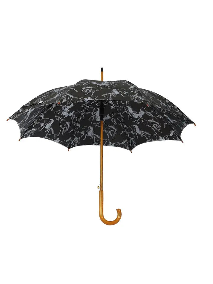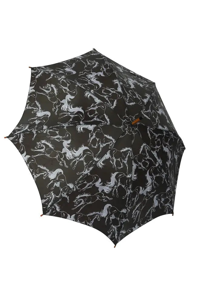 Embrace rainy days with the Lila Umbrella, featuring a striking horse pattern that adds a touch of flair to your rainy-day attire. This umbrella offers a spacious 58cm diameter canopy, and an overall length of 89cm crafted from durable 400gm polyester for excellent protection. The wooden handle with an auto-open button combines style and convenience, making it the perfect accessory for any equestrian enthusiast.